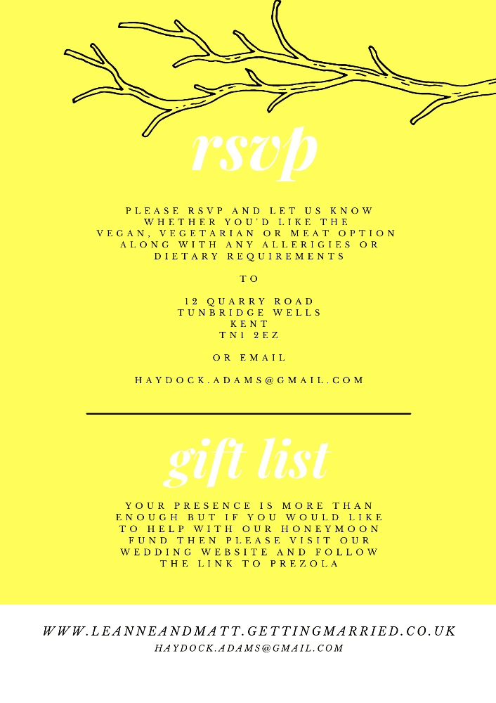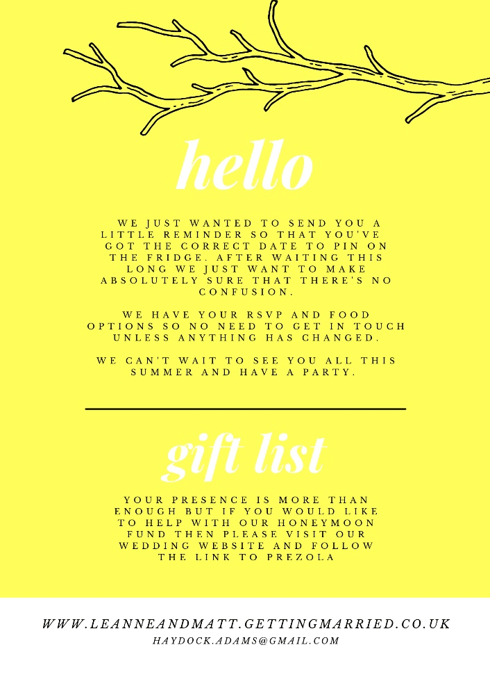 There's a link to a gift list with something called 'Prezzola' which will help us out with the honeymoon so that can get off this mad, wretched little island for a bit - should you feel inclined.